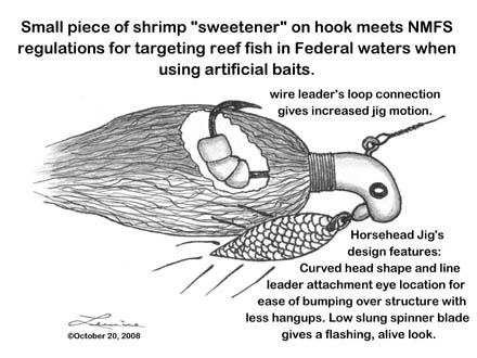 The spinner blade adds its strike-attracting properties to this already deadly combination, and its location virtually ensures that it has no interference with your line or hookups. Its larger head profile also adds mass to your presentation and the flaring, almost breathing bucktail skirting gives a life-like appearance, adding to the total strike attraction. When viewed by a predator from the underside, its silhouette is broken up by the alternating flashes of the spinner blade. Another "alive" look. My first exposure to horsehead jigs was in 1994, when I saw a partyboat captain casting a yellow one of around two ounces. He caught many red snapper from eight to fourteen pounds over the course of several trips. Only after losing all of its hair, most of the paint, and the hook bent and reshaped several times, before breaking, did that jig stop catching red snapper. His success on those trips told me I had to get my hands on some of them, which I did. The Striper Stump Jumper from Bass Pro Shops is available in their catalog or online, www.basspro.com, in sizes up to 1-1/2 ounce. The Blakemore Roadrunner comes topped out at 1 ounce with 1-1/2 ounce unskirted heads available from Cabela's (www.cabelas.com). Head and skirt colors that work for me are yellow, white, chartreuse/white, red/white and blue/white. I know there's some heavier ones out there, but to date I've been unable to find them. The illustration has a cutaway section through the bucktail skirting showing a small piece of shrimp body on the hook as a sweetener that adds some scent to the jig. While a shrimp piece is shown, this could be a piece of other natural bait such as squid or a baitfish. The reason for the small piece of sweetener is that, when fishing for reef fish in Federal waters, using a whole baitfish, squid, shrimp or big baitfish strip on the jig's hook would be illegal. The rule states that circle hooks must be used when fishing for reef fish with natural baits. Fish included in that group are snappers, groupers, amberjacks, hogfish, gray triggerfish, etc. These horsehead jigs and others have "J" hooks. The exception to the rule states that "natural baits include any bait derived from a living organism, either dead or alive." Artificial baits which include a small amount of embedded fish or shrimp are not considered natural baits. Examples of dead baits include cut and frozen fish, shrimp and squid. The sentence about artificial baits and a small amount of embedded fish or shrimp being used makes the tipping procedure described legal in Federal waters when targeting reef fish. Pelagic species such as dolphin, kingfish, wahoo or ling fall into a group that you won't get into trouble with if you nose-hook a sardine, etc. onto the jig. This added size, mass and flash plus the scent trail of the baitfish has one drawback; it will slow your retrieve speed a little. To bring your retrieve up to a strike-generating speed when attempting to attract kingfish or wahoo strikes, a casting reel with a 6:1 retrieve ratio as part of your combination is a must. As far as rigging goes, the pretty much standard, dark swivel and mono leader of 2-3 feet works well. Using a dark coffee colored wire leader has a stealth factor besides its color; its small diameter comes into play. Another plus is increased motion that's given to the jig by a loop connection. With mono, use a loop knot to connect your leader and jig. When used in the proper sizes, with drag settings to match their hook strength, horsehead jigs are lures that should be part of everyone's offshore arsenal. Their look, combined with their structure-dodging abilities, should make them inshore weapons as well. Keep your spinner blades shiny and rinse these horsehead jigs well with fresh water after their saltwater swim for best and long lasting results. "Horsehead Jigs Offshore?" You bet! They're definitely a "try 'em, you'll like 'em" item. | |||